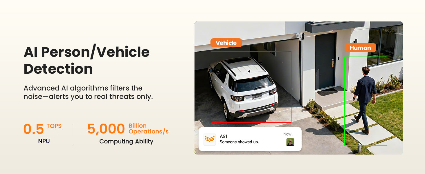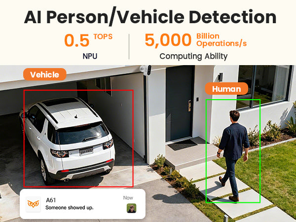 • AI Detection: Advanced AI accurately detects human and vehicle to minimize false alerts.